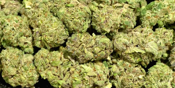 Dense, frosty buds with deep green hues